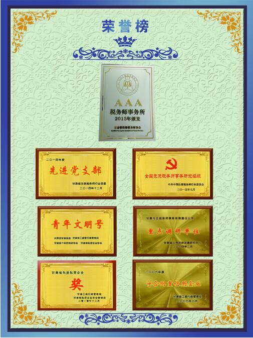 多年來我們遵循正確執(zhí)行稅收法律法規(guī)、依法維護納稅人合法權(quán)益的宗旨,堅持獨立、客觀、公正、高效的執(zhí)業(yè)原則,樹立誠信為本、操守為重、勤勉盡責(zé)、銳意創(chuàng)新的服務(wù)理念,贏得了廣大納稅人的好評,被譽為“管理的參謀、理財?shù)闹帧薄?005年被甘肅省經(jīng)濟發(fā)展研究中心命名為“重點調(diào)研單位”,2007年被甘肅省工商局評為“重合同、守信用”單位,2008年被甘肅省高級人民法院公告為全省司法鑒證稅務(wù)師事務(wù)所四家之一,同年被甘肅省工商行政管理局命名為省級“青年文明號”,2009年被納稅人報社評選為“弘揚、宣傳稅法先進單位”,同年被甘肅省私營企業(yè)協(xié)會命名為常務(wù)理事單位, 2015年被注冊稅務(wù)師協(xié)會認定為甘肅省首家“AAA級稅務(wù)師事務(wù)所”。自中稅協(xié)二屆一次理事會以來一直擔(dān)任中稅協(xié)理事單位和甘肅省稅協(xié)常務(wù)理事單位。2014年被甘肅省注冊稅務(wù)師行業(yè)黨委表彰為“先進黨支部”。2015年被中國注冊稅務(wù)師行業(yè)黨委表彰為“先進黨支部”。
